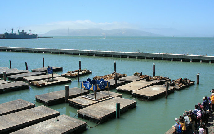 餐馆坐落于码头边。临窗远眺是依稀可见的金门大桥,近处的港口整齐的泊着游艇,桅杆摇曳,岸边木板搭建的漂浮平台上趴着成群的海狮懒正在洋洋的晒太阳。如此近距离接触野生动物,立刻吸引了不少团友们注意力,很多人基本没好好午餐,全程只忙着拍照看海了。这是行程中第一顿特色餐,有酸面包,蔬菜色拉,奶油蛤蜊浓汤、特色螃蟹、意面和甜品。整个一餐还算丰富,国人吃蟹多习惯用醋当调料,其实新鲜螃蟹没有那么腥,天然有些咸鲜,但肉质不够饱满。