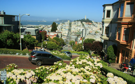 随后前往别致的小景——九曲花街。在旧金山街区中行驶,街道高低起伏,完全打破了我对旧金山的印象。这简直就是一座建在丘陵中的城市,坡度大,落差高,城市几乎没有自行车的存在。一路街道两边的商户有些挂着六色彩旗,这是为了迎接6月底举行的一年一度的同性恋大游行。加州是美国第一个宣布同性恋合法的地区,自然也成为同性恋者的朝圣之地。印有红、橙、黄、绿、蓝、紫六色的旗帜、装饰物散落在城市各处,代表着这个城市的自由与包容。也算是城市的一道独特风景线。