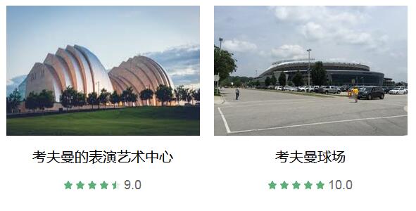 Nelson-Atkins艺术博物馆 、 自由纪念堂和博物馆 、 考夫曼的表演艺术中心 、 乡村俱乐部购物区 、 菲奥雷拉杰克烧烤 、 考夫曼球场 、 Joe's Kansas City 、 国家牛仔与西部文化博物