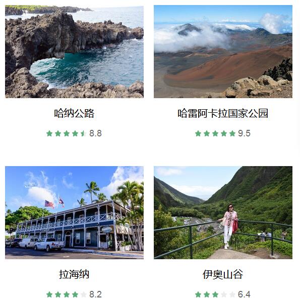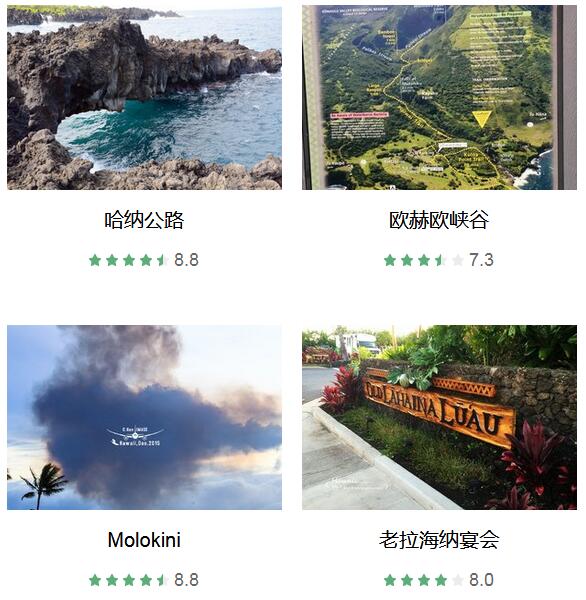 哈纳公路 、 哈雷阿卡拉国家公园 、 黑沙滩 、 卡纳帕利海滩 、 拉海纳 、 伊奥山谷 、 哈纳红沙海滩 、 毛伊海洋中心 、 卡胡鲁伊机场 、 芝士汉堡店 、 卡胡卢伊 、 Bubba Gump
