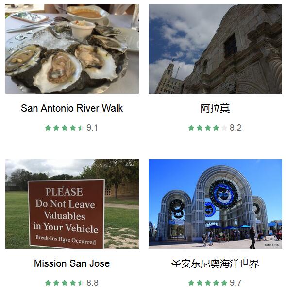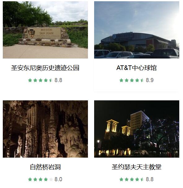 San Antonio River Walk 、 阿拉莫 、 圣安东尼奥历史遗迹公园 、 AT&T中心球馆 、 Mission San Jose 、 圣安东尼奥海洋世界 、 自然桥岩洞 、 圣约瑟夫天主教堂 、 美洲之塔