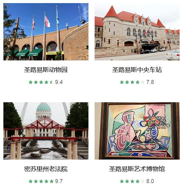 圣路易斯拱门 、 圣路易斯森林公园 、 圣路易斯动物园 、 圣路易斯中央车站 、 圣路易斯大教堂 、 City Museum 、 百威酒厂 、 密苏里州老法院 、 圣路易斯艺术博物馆 、 密苏里植物