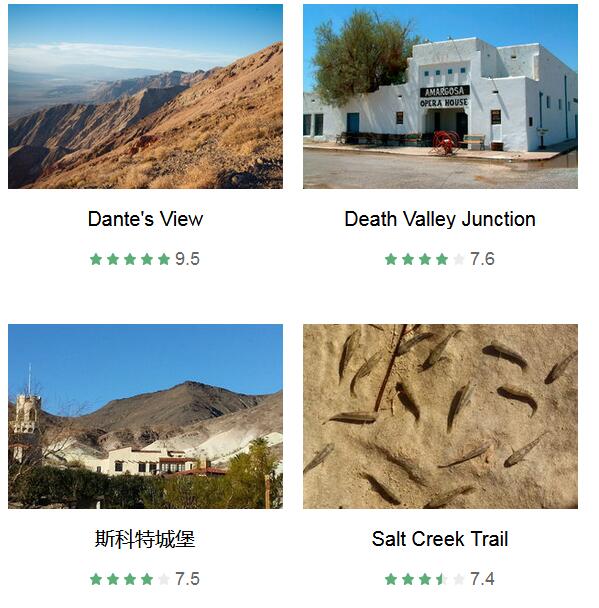 恶水盆地 、 Zabriskie角 、 Dante's View 、 Death Valley Junction 、 大沙丘 、 优比喜比火山口 、 斯科特城堡 、 Salt Creek Trail 、 和谐硼砂矿加工厂 、 会走路的石头 、 金色峡谷