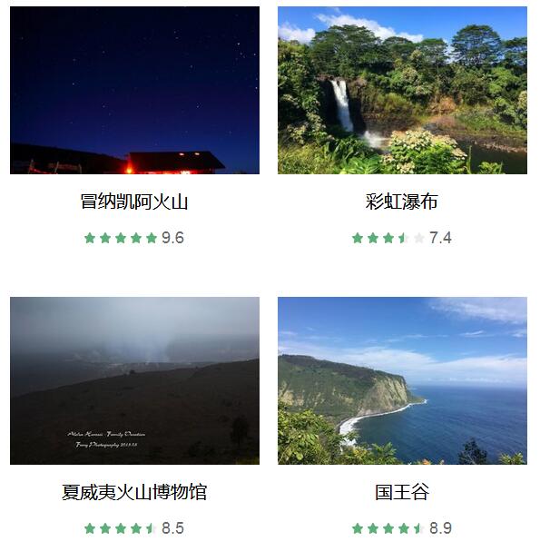 夏威夷火山国家公园 、 普纳鲁吾黑沙海滩 、 冒纳凯阿火山 、 彩虹瀑布 、 夏威夷州政府大楼 、 Kahalu'u海湾 、 夏威夷火山博物馆 、 国王谷 、 库克船长纪念碑