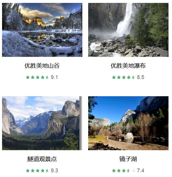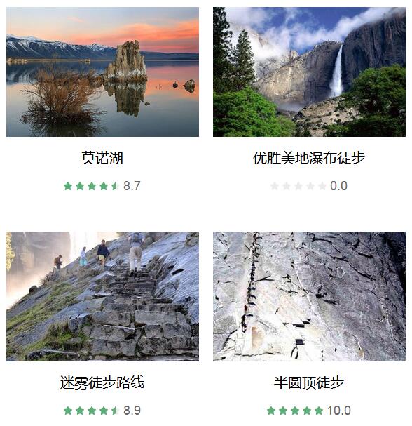 优胜美地山谷 、 优胜美地瀑布 、 新娘面纱瀑布 、 半圆顶 、 隧道观景点 、 镜子湖 、 冰川点观景点 、 莫诺湖 、 马里波萨谷巨杉林 、 伊尔酋长岩 、 土伦草甸 、 优胜美地瀑布徒步