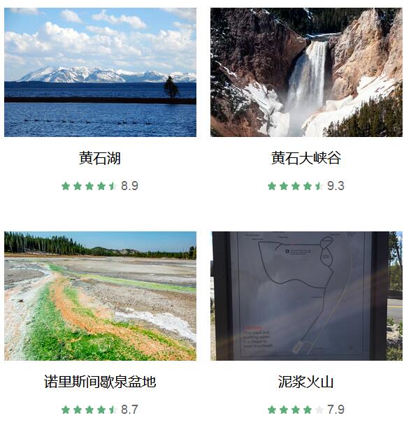 老忠实喷泉 、 大棱镜温泉 、 黄石湖 、 黄石大峡谷 、 猛犸象热泉区 、 西拇指间歇泉盆地 、 诺里斯间歇泉盆地 、 泥浆火山 、 黄石河 、 钓鱼桥 、 塔瀑 、 下间歇泉盆地 、 黑沙盆地