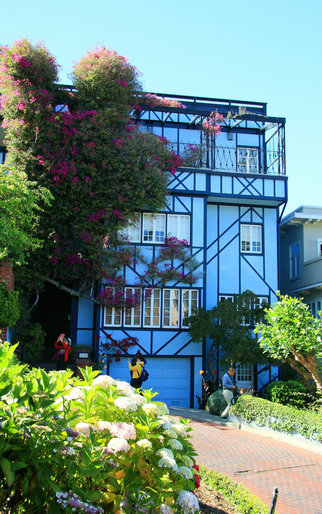 随后前往别致的小景——九曲花街。在旧金山街区中行驶,街道高低起伏,完全打破了我对旧金山的印象。这简直就是一座建在丘陵中的城市,坡度大,落差高,城市几乎没有自行车的存在。一路街道两边的商户有些挂着六色彩旗,这是为了迎接6月底举行的一年一度的同性恋大游行。加州是美国第一个宣布同性恋合法的地区,自然也成为同性恋者的朝圣之地。印有红、橙、黄、绿、蓝、紫六色的旗帜、装饰物散落在城市各处,代表着这个城市的自由与包容。也算是城市的一道独特风景线。