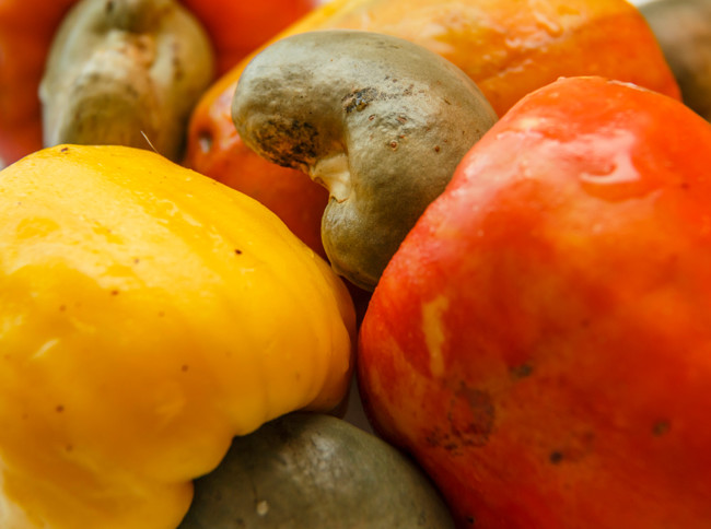 果实的棕色尾部好像看上去很熟悉。但是,别碰它。它充满着一种叫做腰果酸的毒素,如果碰到了会引起皮疹。但是,腰果酸也是个好东西,因为它能被用于医学上,起到抗白蚁的作用。这种酸必须煮熟了,这样里面的东西可以安全食用。