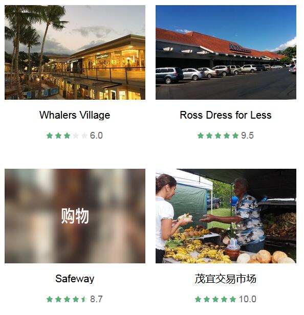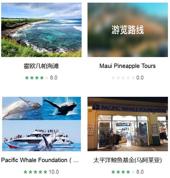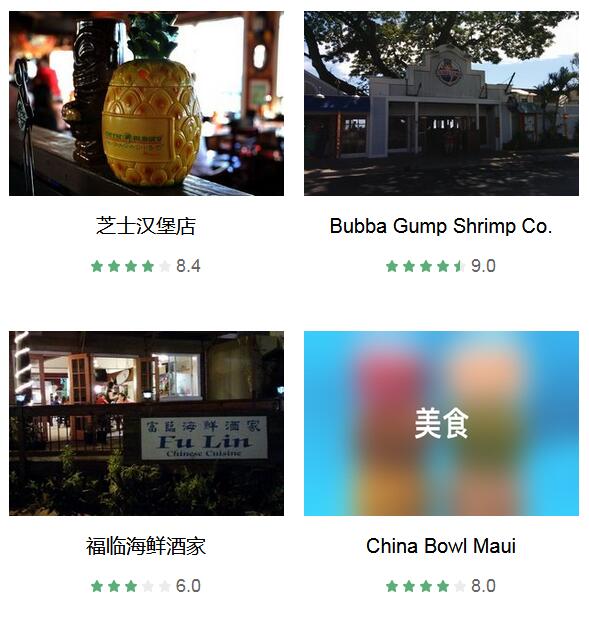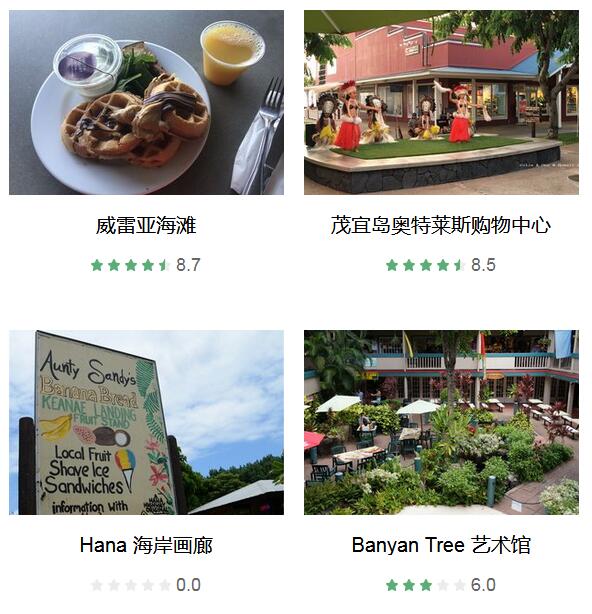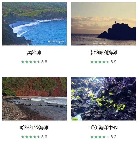 哈纳公路 、 哈雷阿卡拉国家公园 、 黑沙滩 、 卡纳帕利海滩 、 拉海纳 、 伊奥山谷 、 哈纳红沙海滩 、 毛伊海洋中心 、 卡胡鲁伊机场 、 芝士汉堡店 、 卡胡卢伊 、 Bubba Gump