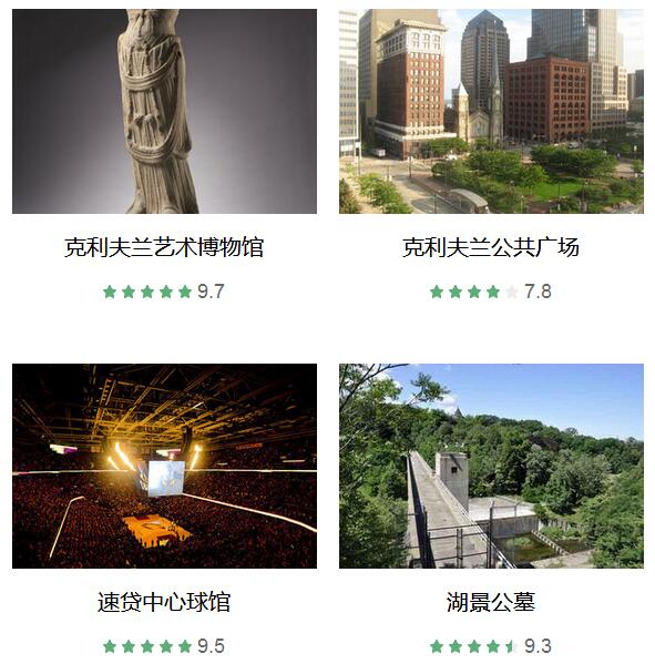 克利夫兰市中心 、 摇滚名人堂 、 克利夫兰艺术博物馆 、 克利夫兰公共广场 、 西侧市场 、 库雅荷加谷国家公园 、 速贷中心球馆 、 湖景公墓 、 终端塔 、 克利夫兰商场 、 西部保留