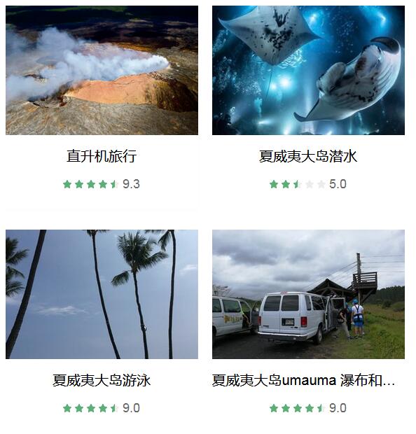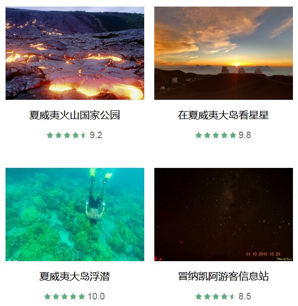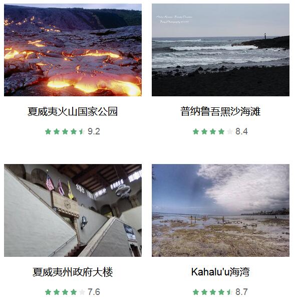 夏威夷火山国家公园 、 普纳鲁吾黑沙海滩 、 冒纳凯阿火山 、 彩虹瀑布 、 夏威夷州政府大楼 、 Kahalu'u海湾 、 夏威夷火山博物馆 、 国王谷 、 库克船长纪念碑