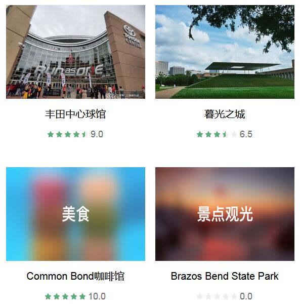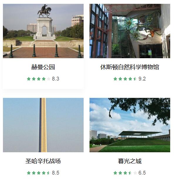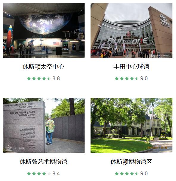 休斯顿太空中心 、 丰田中心球馆 、 赫曼公园 、 休斯顿自然科学博物馆 、 休斯敦艺术博物馆 、 休斯敦奥特莱斯 、 休斯顿博物馆区 、 圣哈辛托战场 、 The Galleria 、 休斯顿乔治布