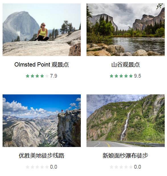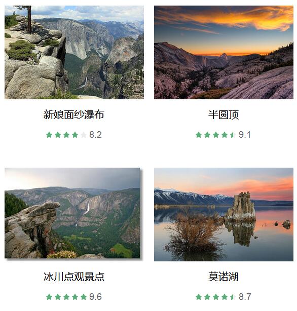 优胜美地山谷 、 优胜美地瀑布 、 新娘面纱瀑布 、 半圆顶 、 隧道观景点 、 镜子湖 、 冰川点观景点 、 莫诺湖 、 马里波萨谷巨杉林 、 伊尔酋长岩 、 土伦草甸 、 优胜美地瀑布徒步