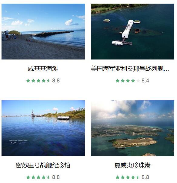 威基基海滩 、 美国海军亚利桑那号战列舰纪念馆 、 夏威夷钻石头山 、 恐龙湾 、 密苏里号战舰纪念馆 、 夏威夷珍珠港 、 威基基海滩大道 、 欧胡岛伊欧拉尼皇宫 、 夏威夷火山国家...