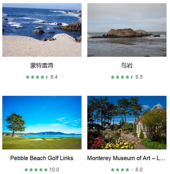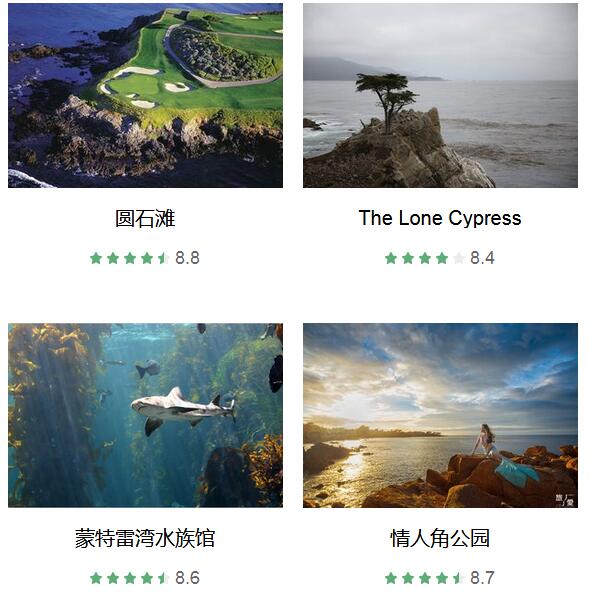 蒙特雷湾 、 老渔人码头 、 圆石滩 、 The Lone Cypress 、 鸟岩 、 海豹岩 、 蒙特雷湾水族馆 、 情人角公园 、 蒙特雷半岛休闲远足路线 、 加拉帕塔海滩 、 Pebble Beach Golf Links
